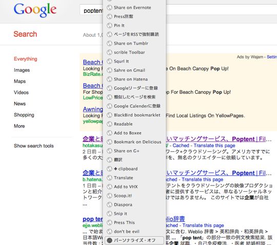 そこでこのブックマークレットをたまには使って個人化されていない検索結果に触れてみましょう。けっこう違うんだよね、これが。。。